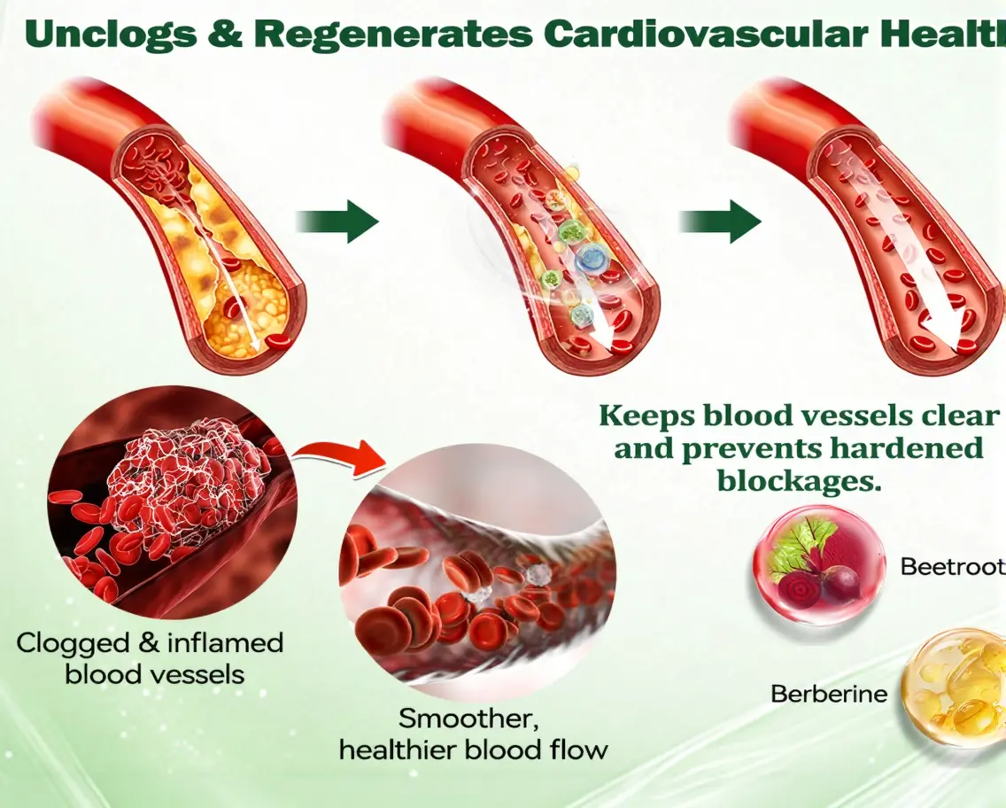 Resveratrol enhances the activation of SIRT1 and promotes nitric oxide production in vascular endothelial cells, thereby improving vasodilation. Berberine, Coenzyme Q10, and citrus polyphenols act synergistically on inflammatory and lipid-metabolism pathways to promote fat metabolism and reduce visceral fat accumulation. This multi-pathway synergy helps maintain more youthful and elastic blood vessels, optimizes hemodynamics, balances lipid profiles, and strengthens overall cardiovascular resilience.