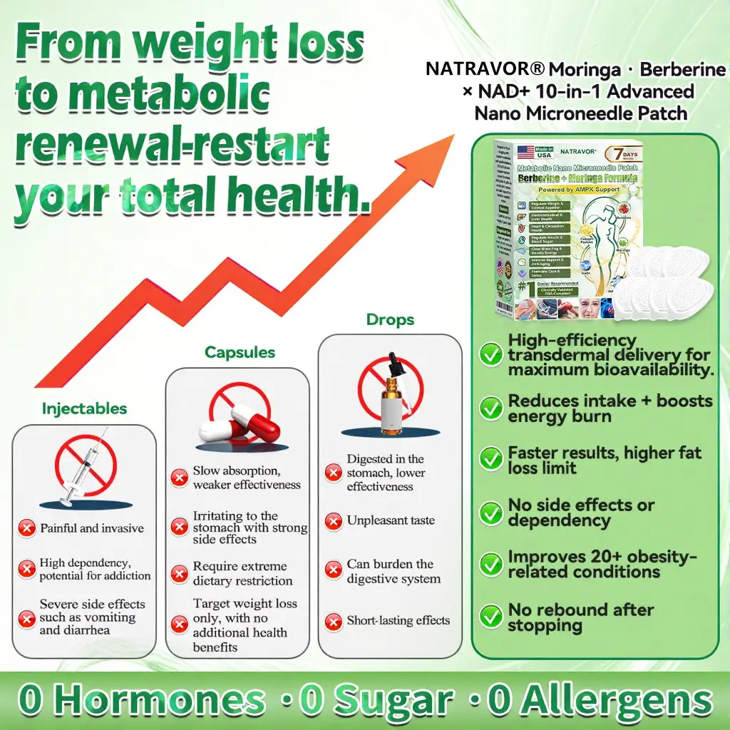 ✅ NATRAVOR® 𝑴𝒆𝒕𝒂𝒃𝒐𝒍𝒊𝒄 𝑵𝒂𝒏𝒐 𝑴𝒊𝒄𝒓𝒐𝒏𝒆𝒆𝒅𝒍𝒆 𝑷𝒂𝒕𝒄𝒉 breaking away from the burden of traditional injectable or oral weight-loss products, this advanced nano microneedle transdermal delivery system gently and steadily releases active ingredients for up to 8 hours. Core ingredients Moringa and Berberine work synergistically to support appetite management and lipid metabolism, making fat loss feel more natural and effortless—without extreme dieting or physical strain. At the same time, NAD⁺ supports cellular energy levels and skin firmness, helping maintain a healthy, well-toned appearance during body-weight changes. The overall formula is gentle and stable, offering a more comfortable experience for those seeking an effective, non-irritating, and non-injectable approach to weight management.