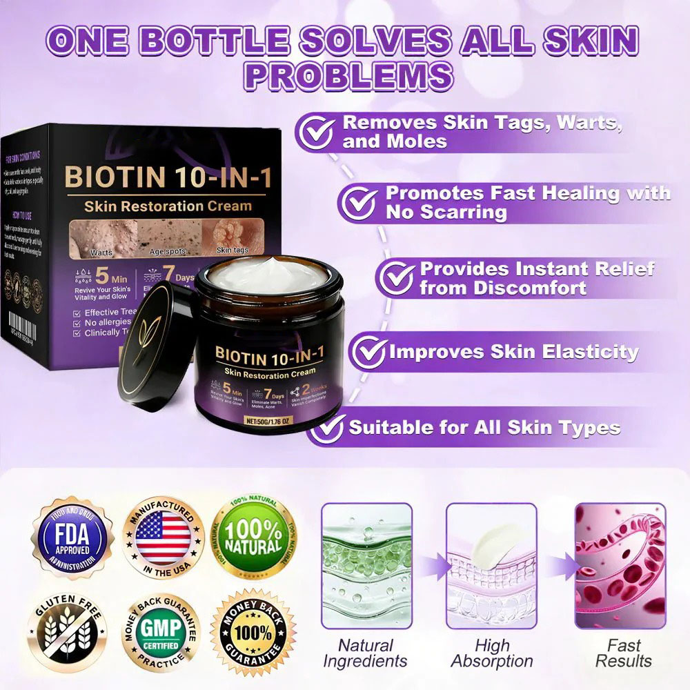 Say goodbye to the discomfort caused by skin tags, psoriasis, vitiligo, varicose veins, sagging, wrinkles, and age spots. Use NATRAVOR® Biotin 10-in-1 Skin Restoration Cream to restore smooth, youthful, and radiant skin without the hassle.