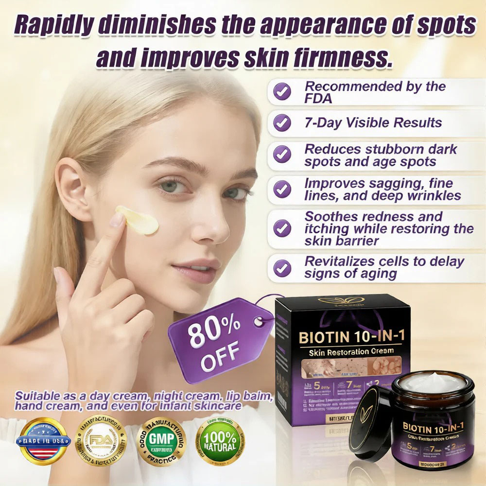 When I turned seventy, I looked more like eighty — my face was dry, rough, and full of deep lines that told every story of my life. Years of sunshine and sweet tea had left my skin dull and covered with dark age spots, and I used to laugh and say, “Guess my skin’s aging faster than I am!” But after using NATRAVOR® Biotin 10-in-1 Skin Restoration Cream for just a few weeks, I couldn’t believe my own reflection. The age spots began to fade, the deep wrinkles softened, and my skin actually felt smooth and alive again. It absorbs beautifully and really helps stimulate collagen and rejuvenate aging skin — something I thought was impossible at my age. Now my friends keep asking if I secretly had a facelift, and I just smile and say, “No surgery, no needles — just this little miracle in a jar”—BrendaCollins⭐⭐⭐⭐⭐