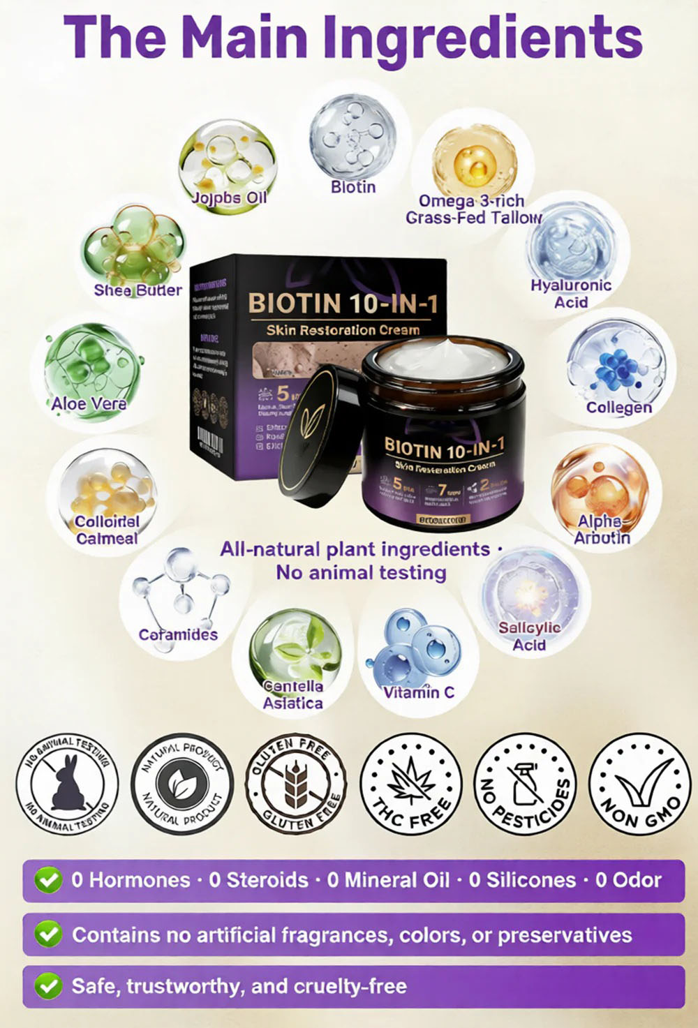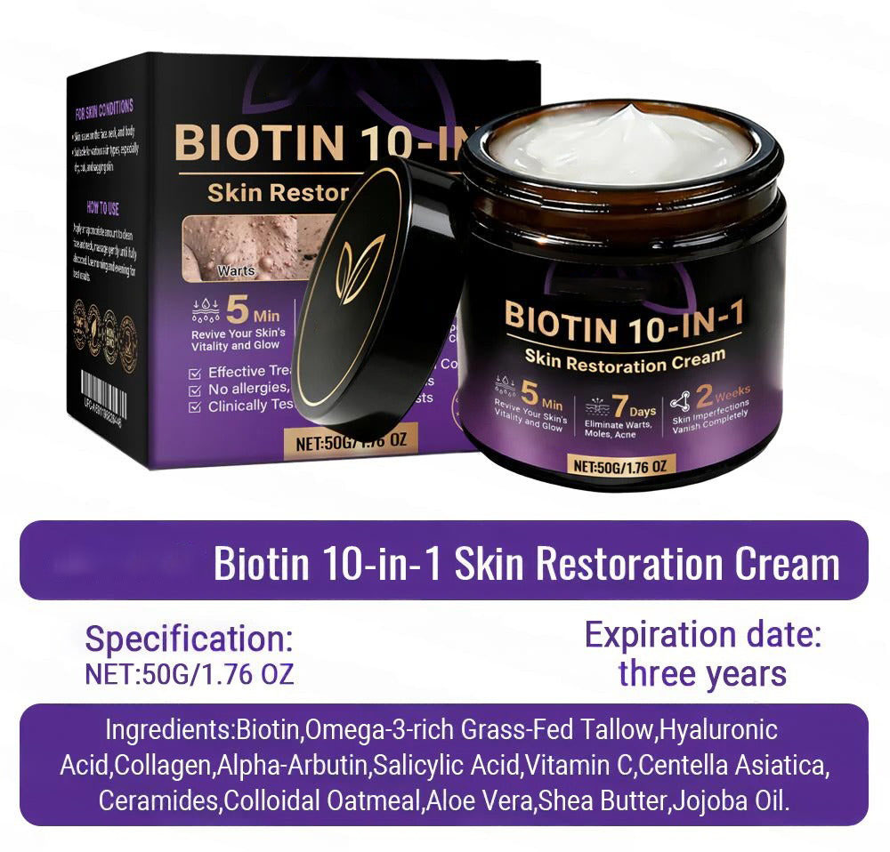 In response, NATRAVOR® Biotin 10-in-1 Skin Restoration Cream was scientifically developed under rigorous standards. Its formula combines the restorative power of natural biotin and collagen, synergized with hyaluronic acid, vitamin C, centella asiatica, and over ten other potent bioactive ingredients. Together, they deliver multi-dimensional care — from deep hydration and barrier repair to anti-inflammatory relief, itch control, metabolic renewal, tissue restoration, and anti-aging nourishment. Clinically validated and produced in GMP-certified facilities compliant with U.S. and EU safety standards, this cream offers a safe, effective, and drug-free multi-repair skincare solution for dryness, inflammation, irritation, and signs of aging — restoring comfort, resilience, and lasting skin health.