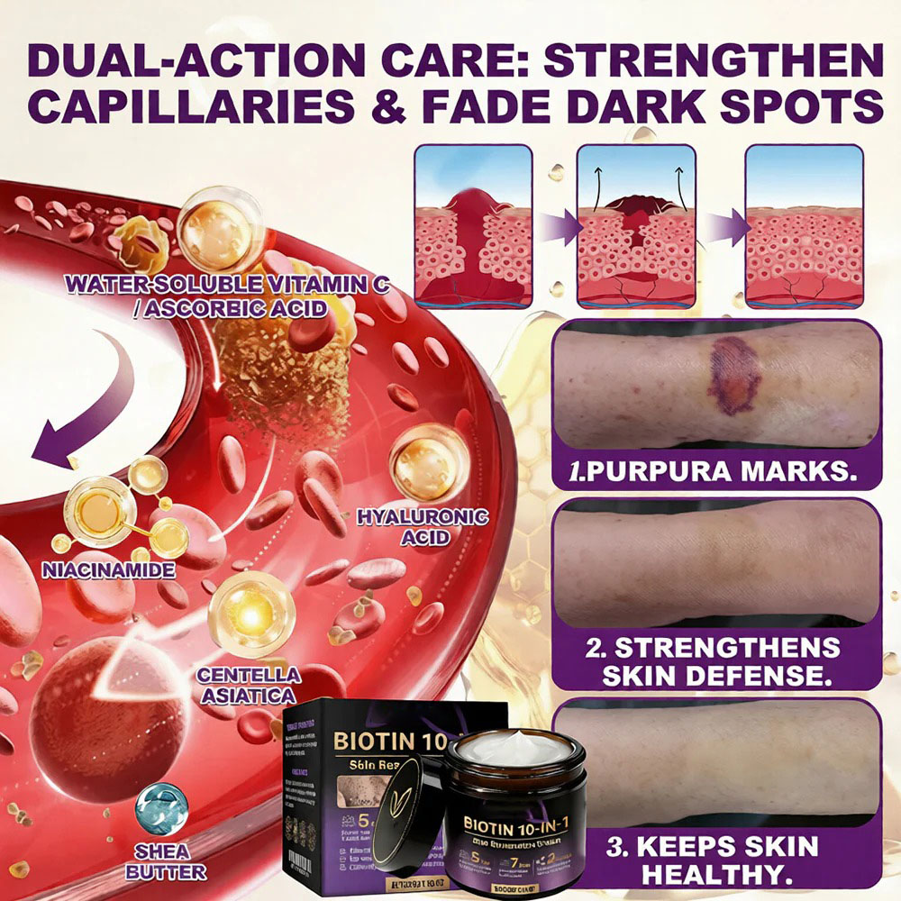 Age spots and senile purpura are often caused by sun exposure and fragile capillaries. NATRAVOR® Biotin 10-in-1 Skin Restoration Cream combines alpha-arbutin, water-soluble vitamin C, and hyaluronic acid to brighten the complexion, visibly improving uneven pigmentation within 7 days. Centella asiatica strengthens capillaries, helping purpura fade by up to 68% in 14 days. Biotin and collagen peptides accelerate the natural shedding of pigmented cells, boosting skin renewal efficiency by 35%.