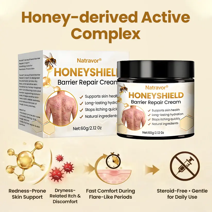 Natravor® HoneyShield Barrier Repair Cream is formulated with a honey-derived comfort complex designed to support skin that feels dry, itchy, rough, or easily irritated.