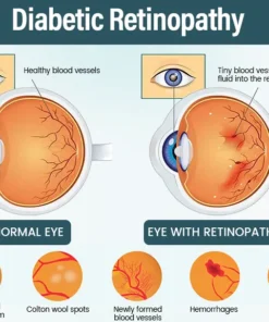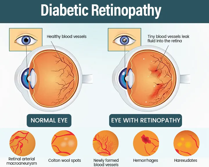 Diabetic Retinopathy: Uncontrolled blood sugar damages the tiny blood vessels in the retina, leading to leakage, bleeding, and abnormal new vessels — causing irreversible vision loss.
