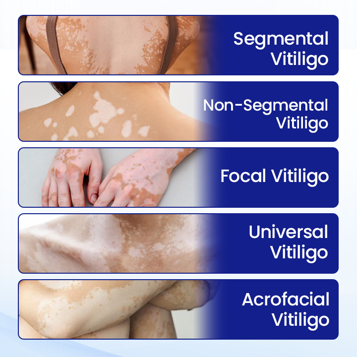 Focal Vitiligo: 5-10% of cases (subtype of non-segmental). Small, localized patches. Limited to specific areas. May remain stable or progress to generalized type.